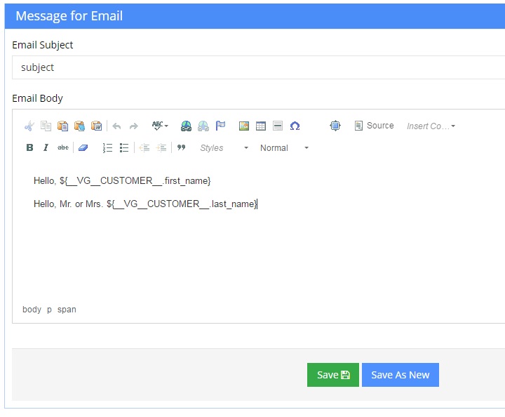 Now comes the fun part, creating the content of the new email message. This is a standard WYSIWYG editor, allowing you to know exactly how it will look on the recipients device. Below are some examples of how to dynamically insert CRM data. For a more complete listing of CRM field variable names, check out the Email Personalization Guide.